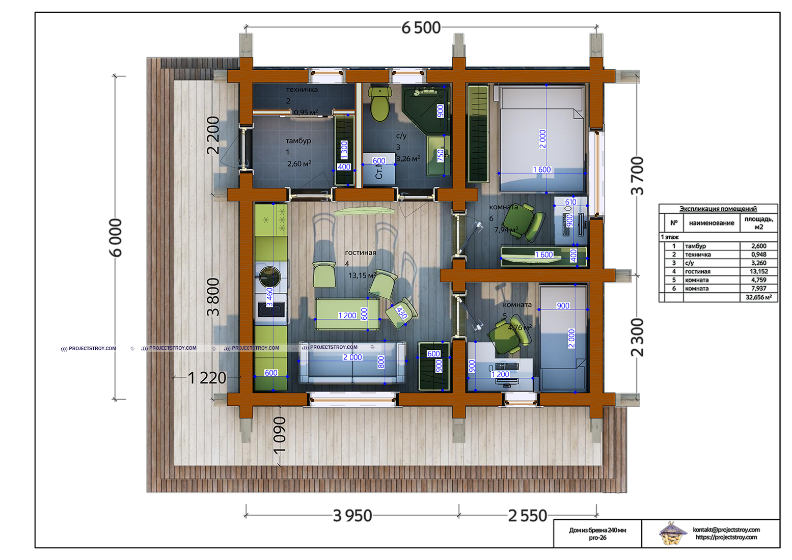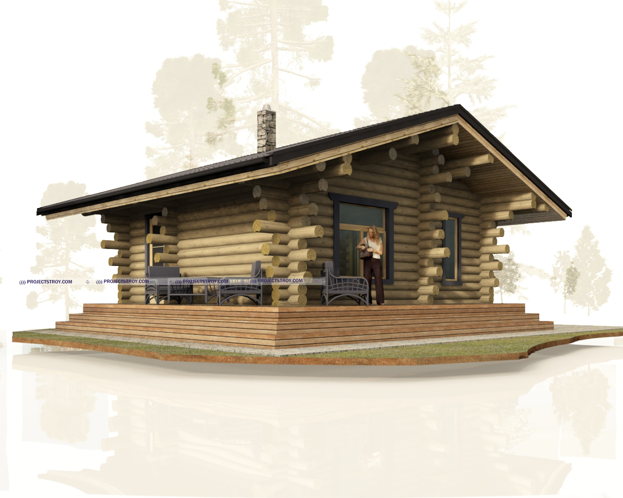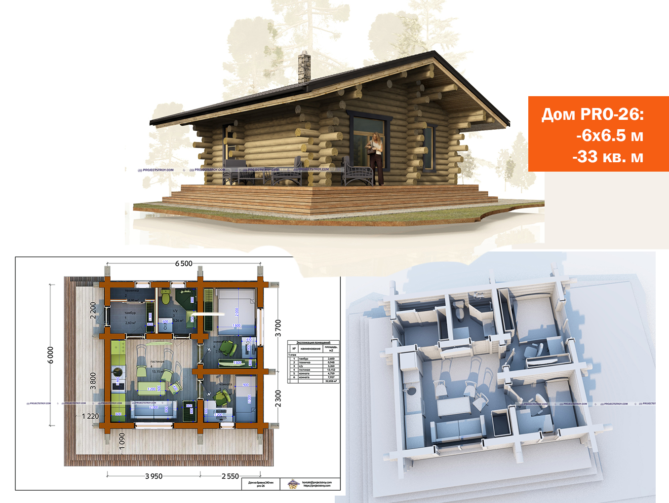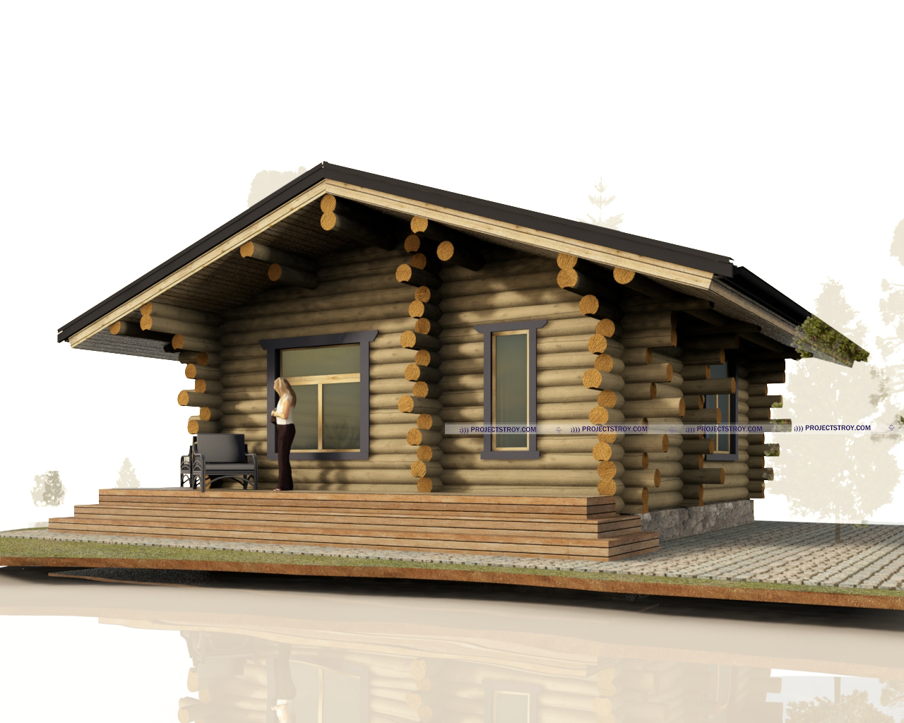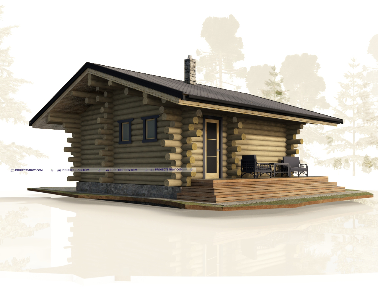 Одноэтажный дом с тремя комнатами из бревна