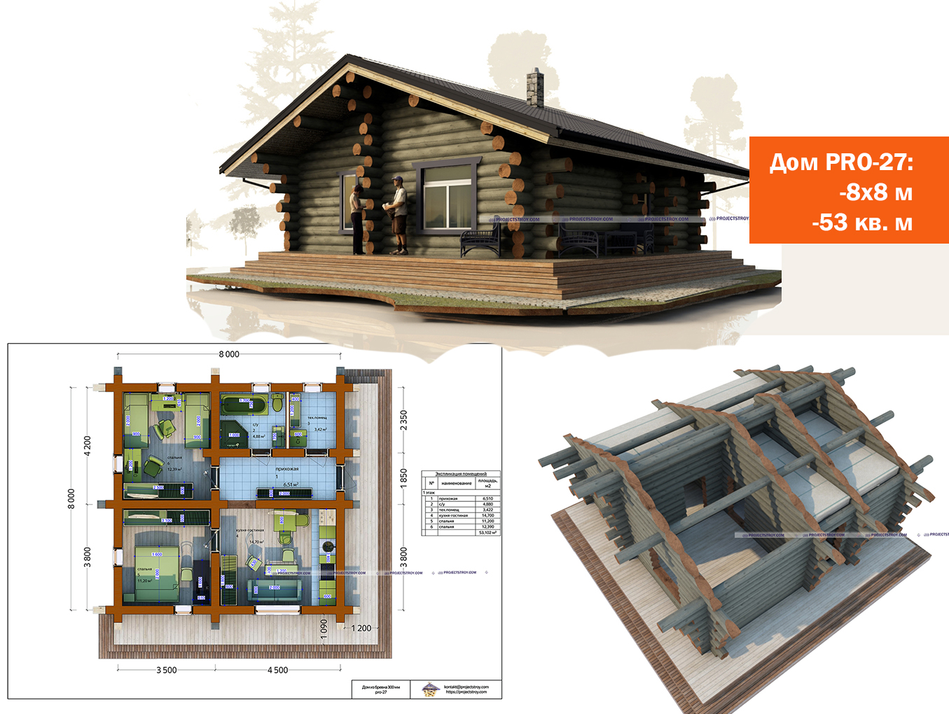 Деревянный дом 8х8 м, ручная рубка