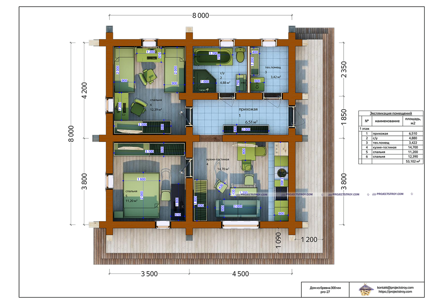-общая площадь по экспликации - 53 кв. м;